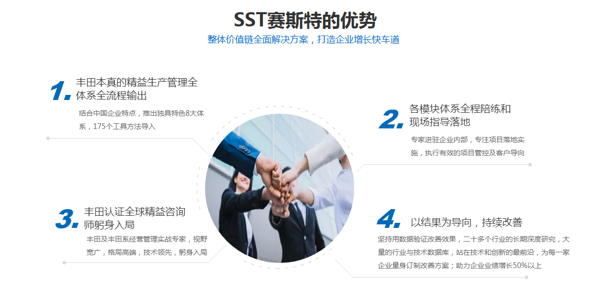賽斯特集團(tuán)(SST)是豐田為背景的一家致力于企業(yè)管理咨詢、培訓(xùn)服務(wù)為主的國際化管理咨詢機(jī)構(gòu),依托于精益發(fā)源地豐田公司為背景的專家團(tuán)隊,專業(yè)從事精益生產(chǎn)培訓(xùn)和咨詢服務(wù)的管理咨詢機(jī)構(gòu),中國本土唯一一家融合日本豐田,北京現(xiàn)代,韓國三星等專家為一體的咨詢機(jī)構(gòu)。旗下?lián)碛校禾旖蛸愃固仄髽I(yè)管理咨詢公司,天津眾益天成管理咨詢公司,北京冠群精益管理咨詢公司,天津精益智能咨詢有限公司等四家分支機(jī)構(gòu)。